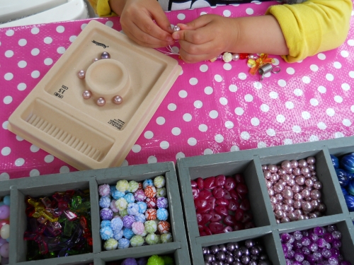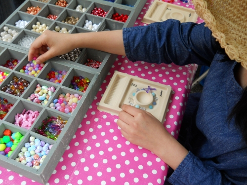 100種類以上のビーズの中からお客さま自身で自由に専用トレーにビーズを選び、ゴムを通していただきます。ゴムを結んで接着剤で補強しての仕上げはこちらで行いますので2歳程度のお子さんからご参加いただけます。